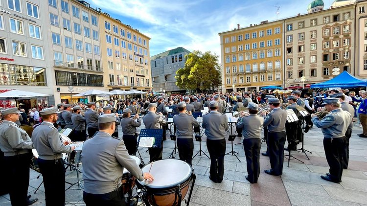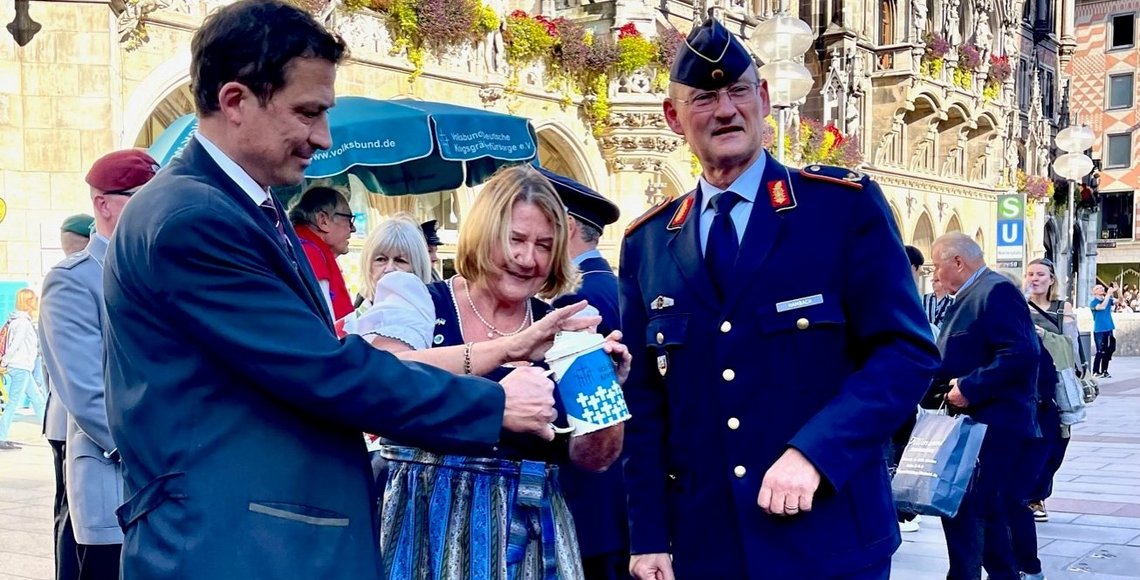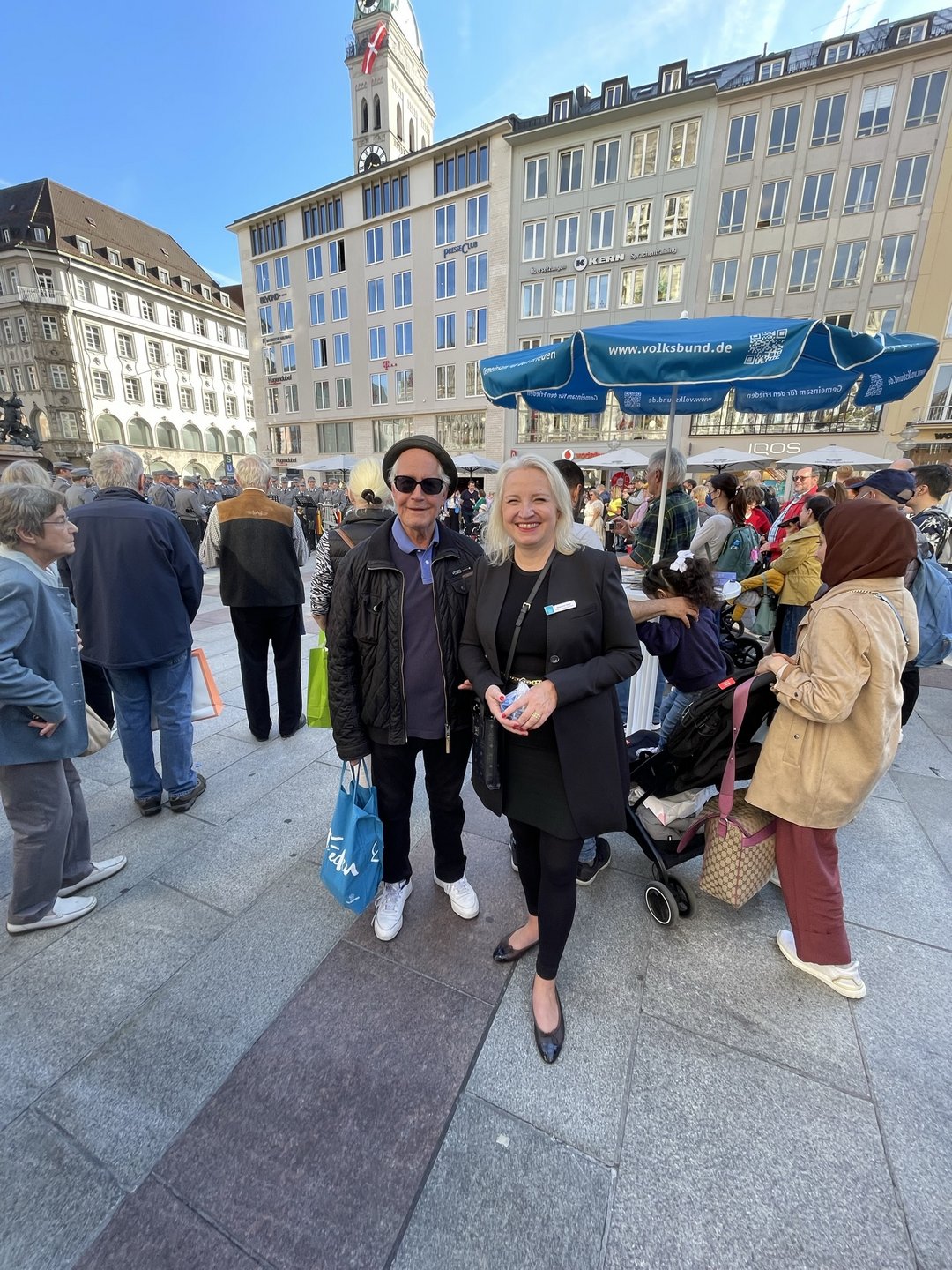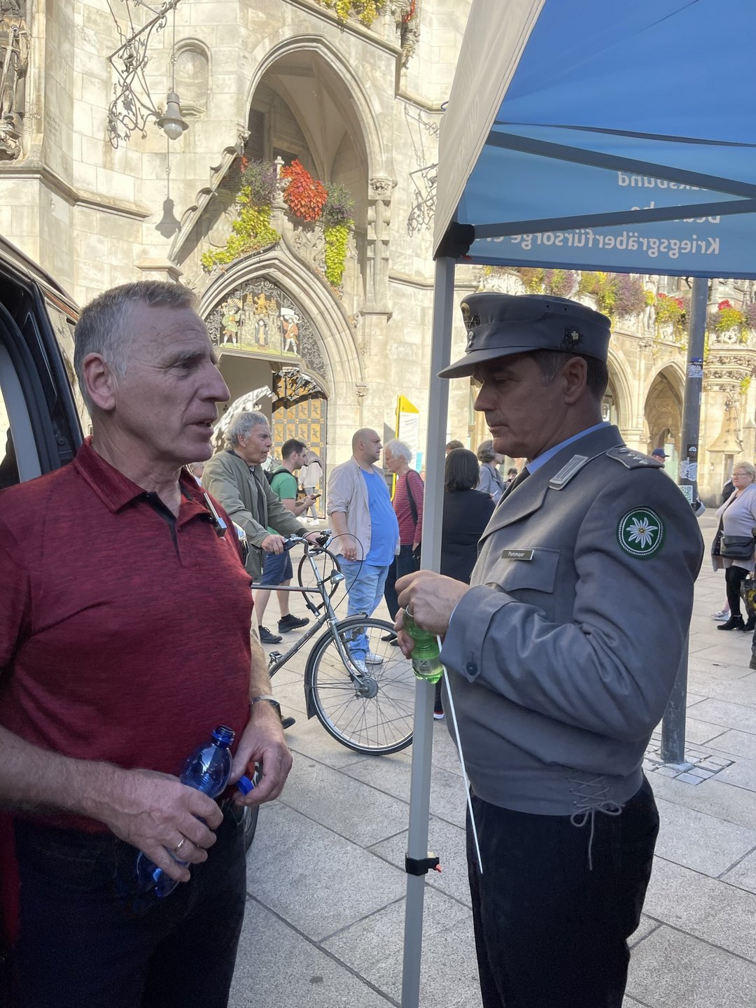 Es war eine wahrhaft beeindruckende Veranstaltung am 17. Oktober 2022 im Herzen unserer Landeshauptstadt München. Auf dem Marienplatz drängten sich unzählige Menschen und verweilten bei unserem einstündigen Standkonzert mit einem großartig aufgelegten Gebirgsmusikkorps aus Garmisch Partenkirchen unter der Leitung von Hauptmann Rudolf Piehlmayer. Die mitmoderierten Informationen zur Friedensarbeit unseres Volksbundes wurden interessiert aufgenommen und unsere prominenten Sammler aus der Politik und Bundeswehr, dem Reservistenverband und Traditionsvereinen freundlich bedacht.