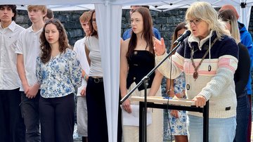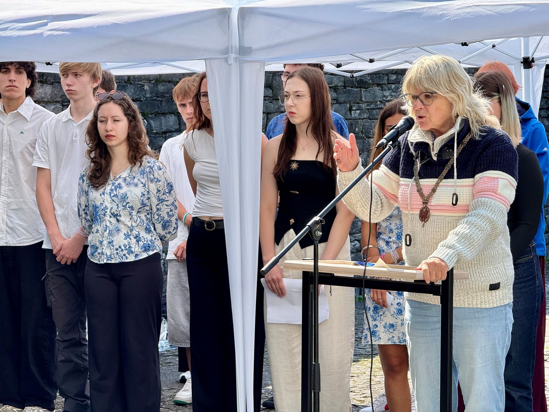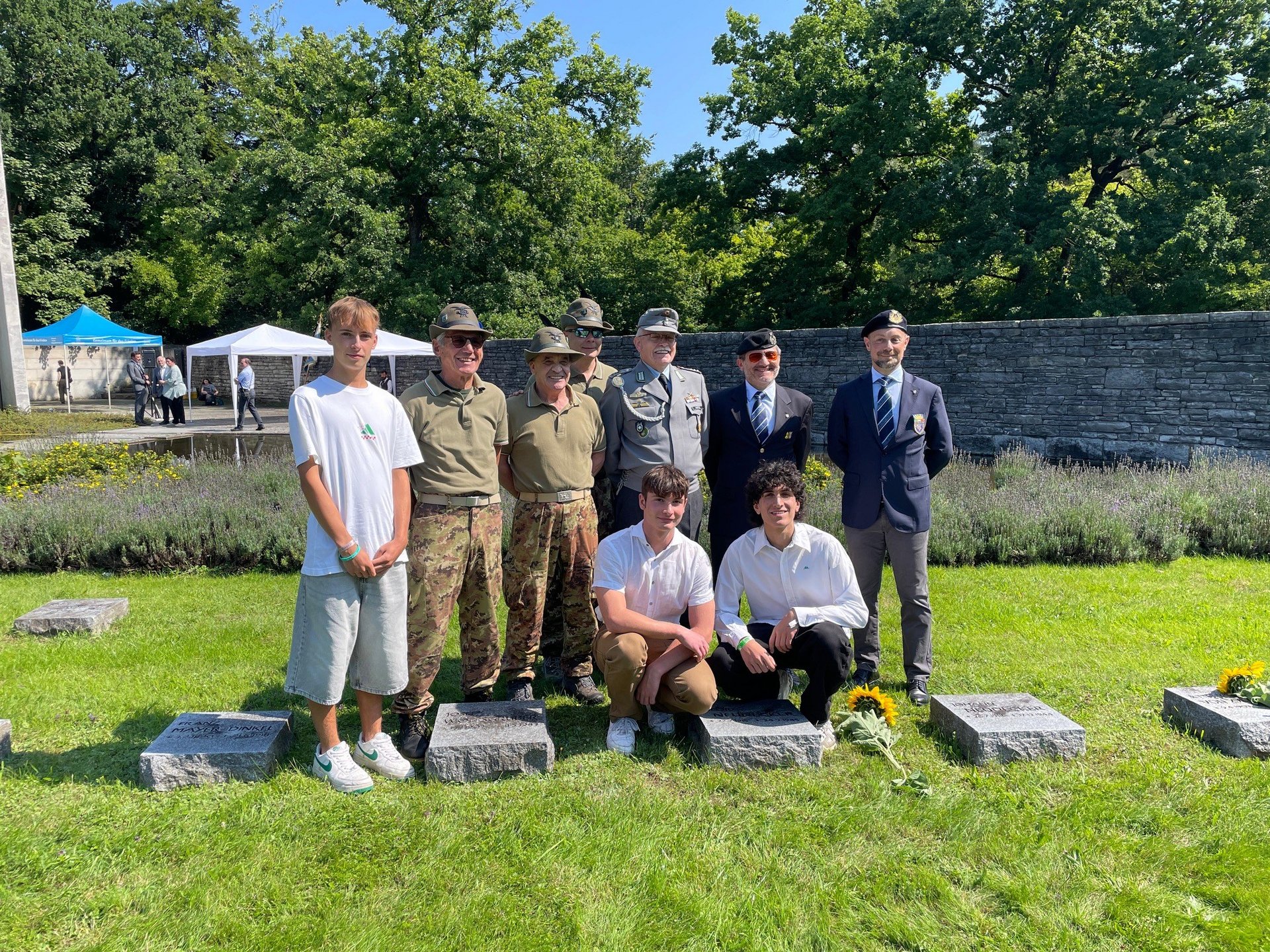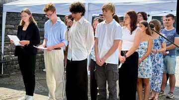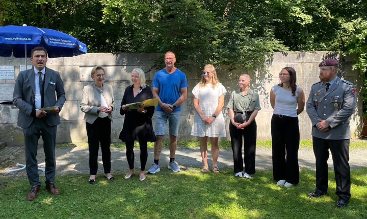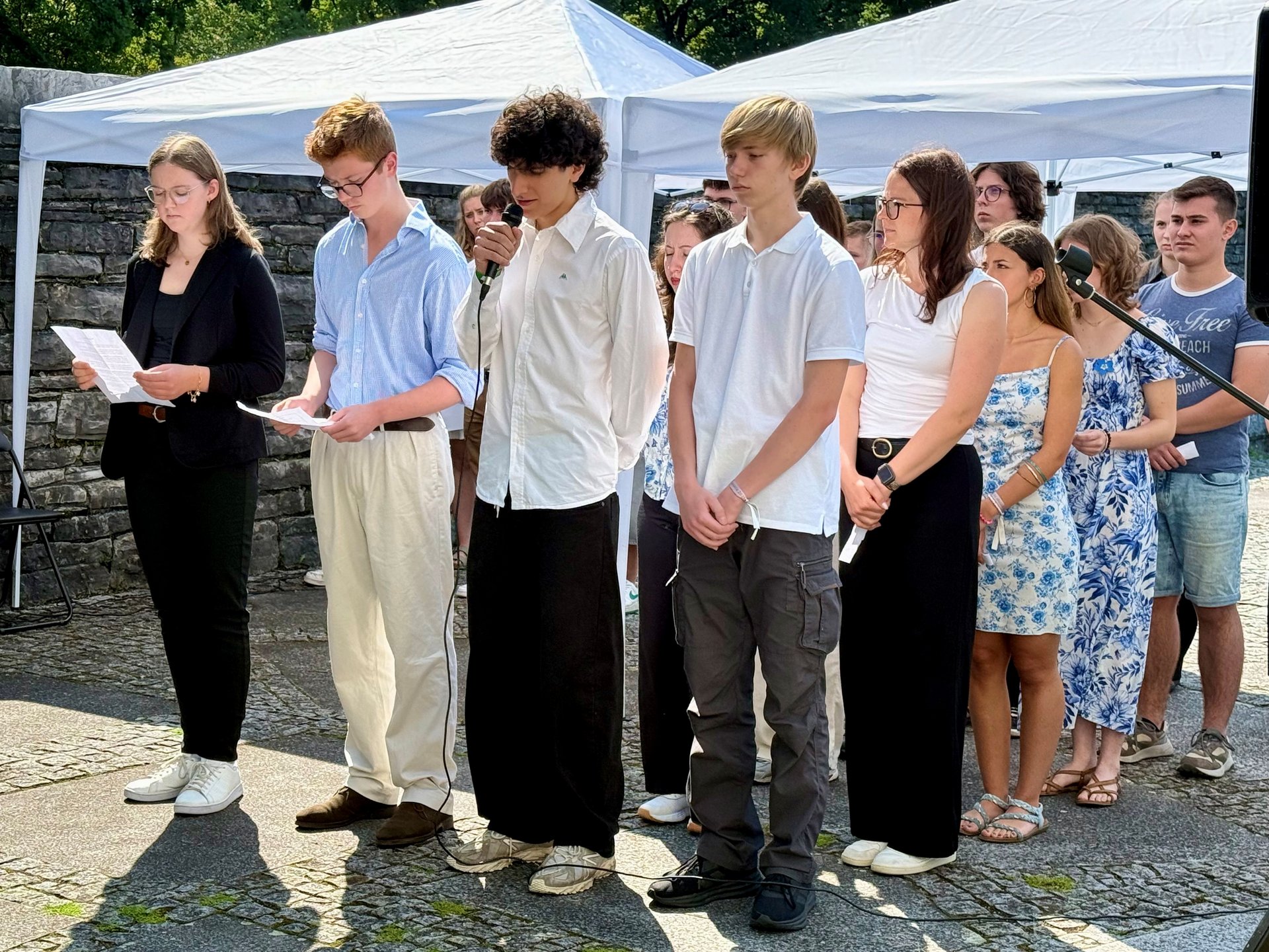 Anschließend brachten der Leiter des ehrenamtlichen Betreuungsteams, Hauptmann Samuel Ortmanns, und die jungen Teilnehmerinnen und Teilnehmer ihre Gedanken zum Camp, zur Arbeit des Volksbunds und zu ihrem Friedensprojekt zum Ausdruck. Es folgte das Totengedenken, das in den Sprachen aller Gastnationen vorgetragen wurde. Abrundung fand die Zeremonie in einem Liedbeitrag. Hierfür hatten die Jugendlichen „Hallelujah“ von Leonhard Cohen einstudiert. Das Publikum stimmte gerne mit ein.